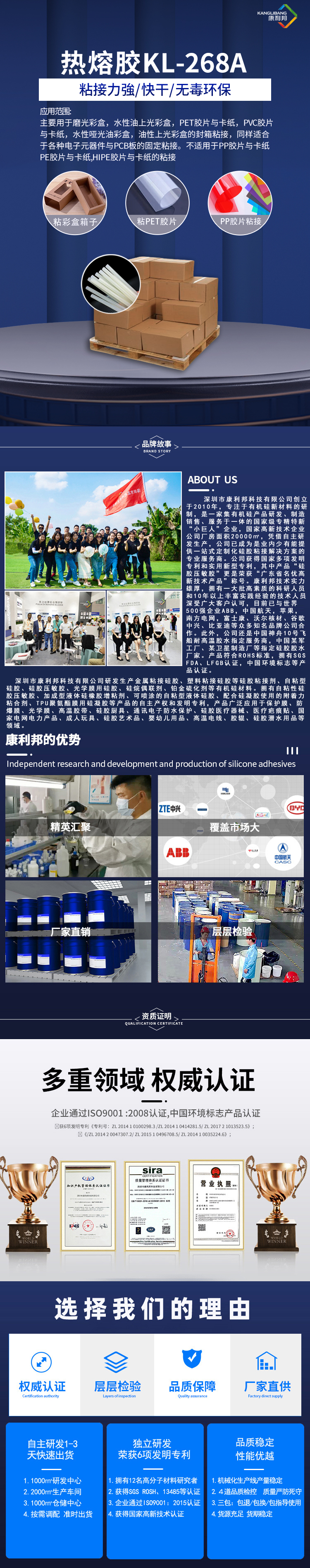 KL-268A熱熔膠具(jù)有粘接力強、快幹、無毒環保、應用廣的特點,由於KL-268A熱(rè)熔(róng)膠應用範圍廣(guǎng)泛,其(qí)用法的正確性和適用性,超出本公司(sī)管控範圍,因此使用者在使用之前需再做進一步的確認。