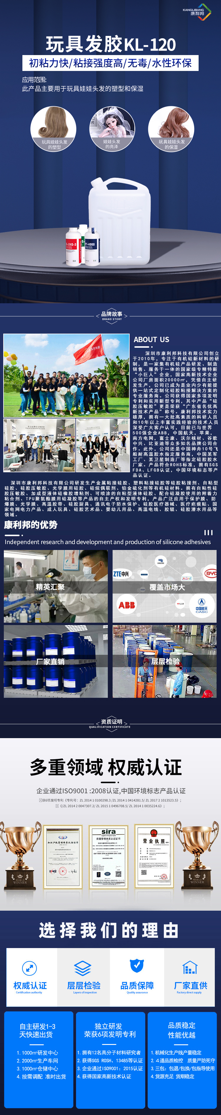 KL-120玩具發膠是由特殊單(dān)體經聚合合成的粘合劑,具有穩(wěn)定性好,應用範(fàn)圍廣,無毒、環保及對皮膚無不(bú)良反應的特點。KL-120玩具發膠用(yòng)法的正確性和(hé)適用性,超出本公司管控範圍,因此使用者在(zài)使用之前需再做進一步的確認。