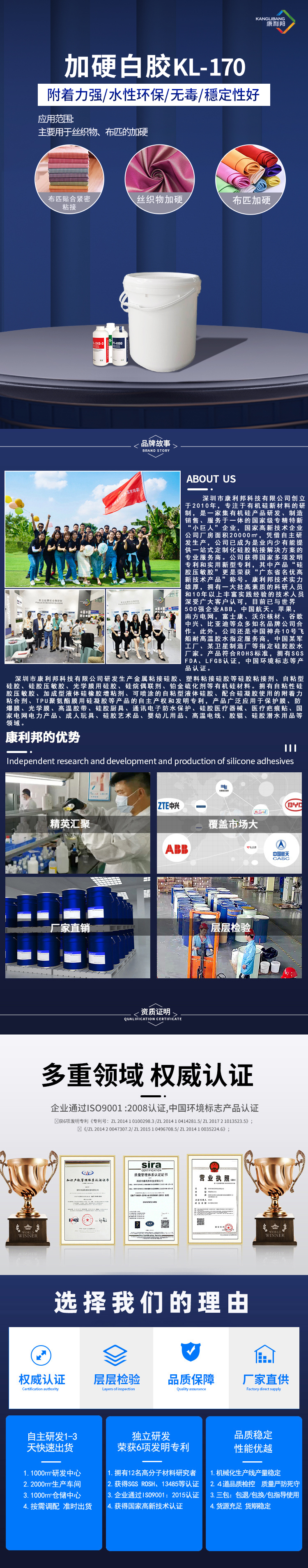 KL-170加硬白膠是由特殊單體經聚合合成的粘合(hé)劑,具有穩定性好,應用範圍廣,無毒、環保及對皮膚無不良反應的特點。由於KL-170加硬白膠應用範(fàn)圍廣泛,其用法(fǎ)的正確(què)性和適用性,超出本公司(sī)管控範(fàn)圍,因(yīn)此使用者在使用之前需再做進一步的確認。