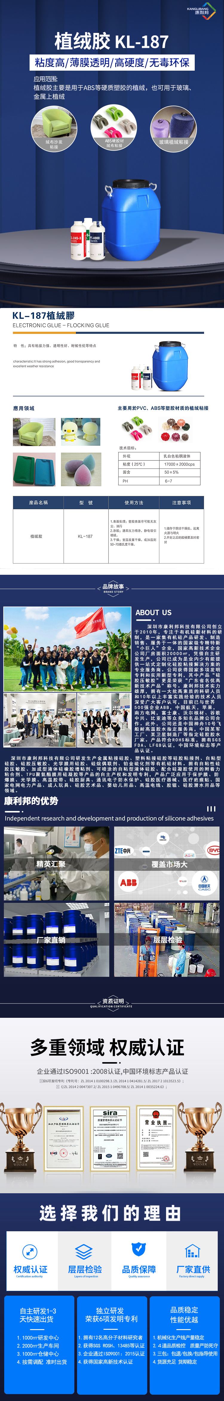 KL-187植絨膠是以多(duō)種丙(bǐng)烯酸單體.用乳液聚合(hé)法(fǎ)聚合(hé)而成的強粘力乳液,具有粘度高、薄膜透明、高硬度、儲存性(xìng)能穩定等優良特性,耐熱性也優於其(qí)他(tā)白膠,KL-187植絨膠應用範圍廣,無毒環保,對(duì)皮膚無不良作用。