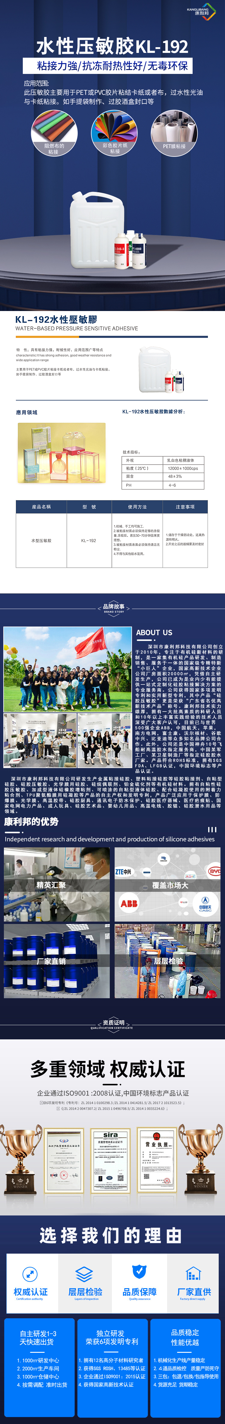 深圳市康利邦科技有限公司(sī)創立(lì)於2010年,專注於(yú)粘合劑新材料的研製,是一家集粘合劑新材料研發、製造、銷售、服務於一(yī)體的國家級專精特新“小巨(jù)人”企業、國家高新技術企業。公司(sī)廠房麵積(jī)40000㎡,憑借自主研發生產,公司(sī)已成為一站式定製化膠粘解決方案的專(zhuān)業服務商。