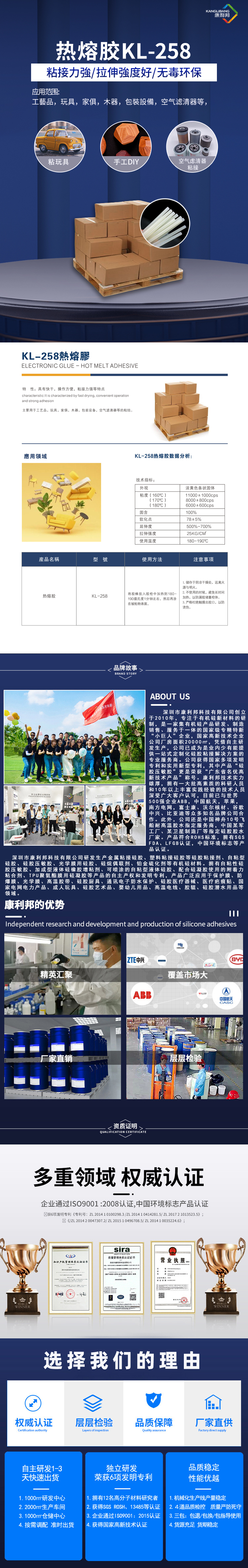 KL-258熱熔膠:本產品是由多種樹脂聚合而(ér)成,具有快幹、粘結力強、應用廣等特點,由於KL-258熱熔膠應用範圍廣泛,其用法的正確性和適用性,超出本公司管控範圍,因此(cǐ)使用者在使用之前需再做進一步的確認。