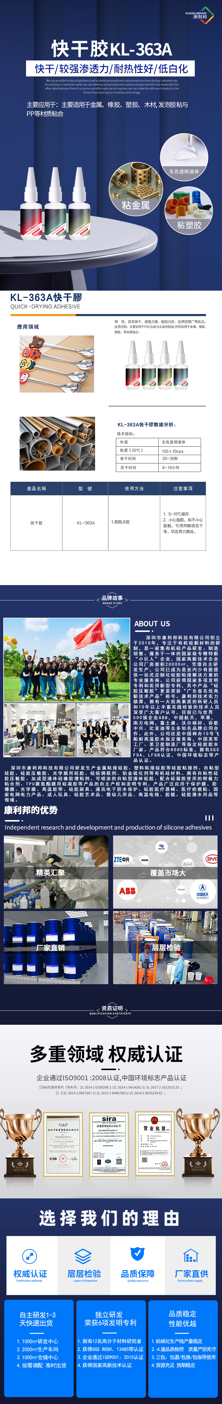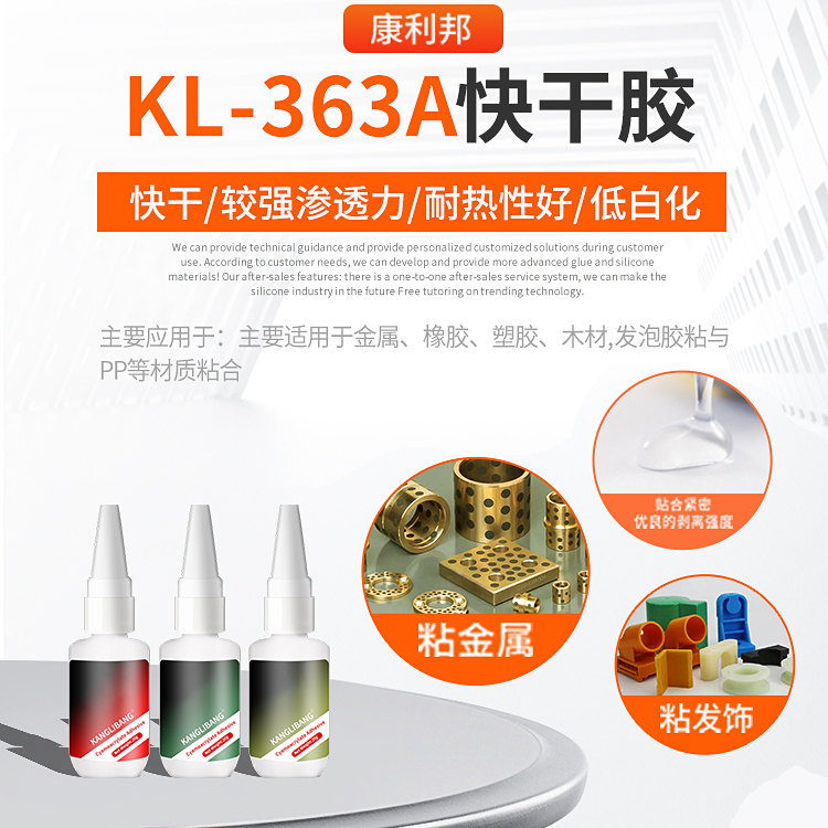 KL-363A快幹膠是一(yī)種單組份的(de)丙烯酸酯(zhǐ)粘合劑(jì), 它不用加熱, 無(wú)需溶劑, 在室溫下快速固(gù)化,且粘合強度很高。