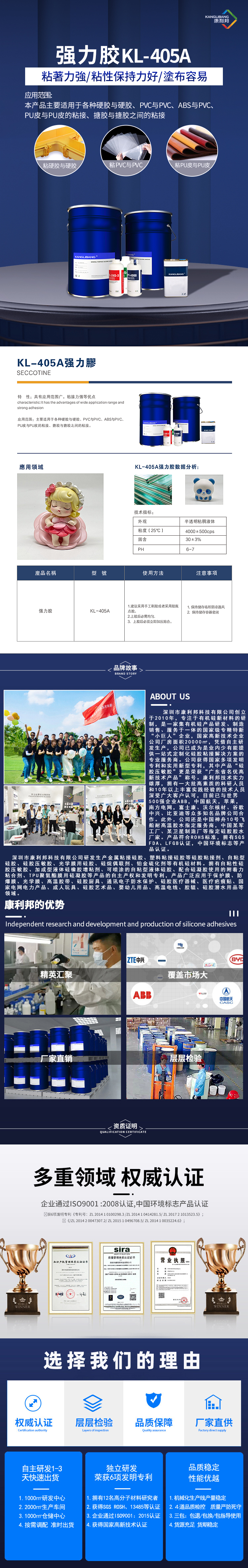 KL-405A強力膠(jiāo)是由有機溶劑, 高分子合成樹脂組成的一種溶劑型接著劑, 它具有應用範圍廣, 粘接力強等優點。