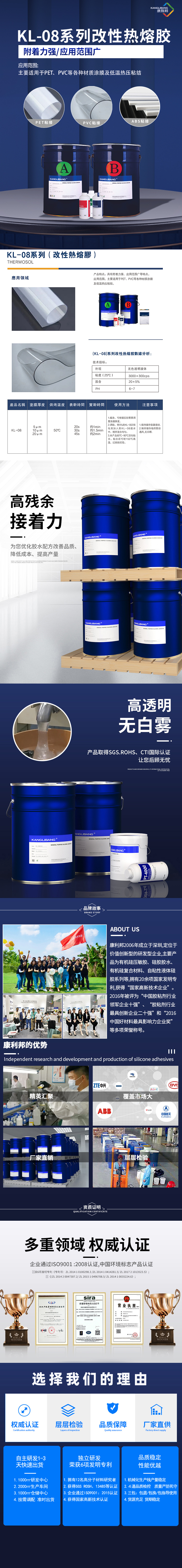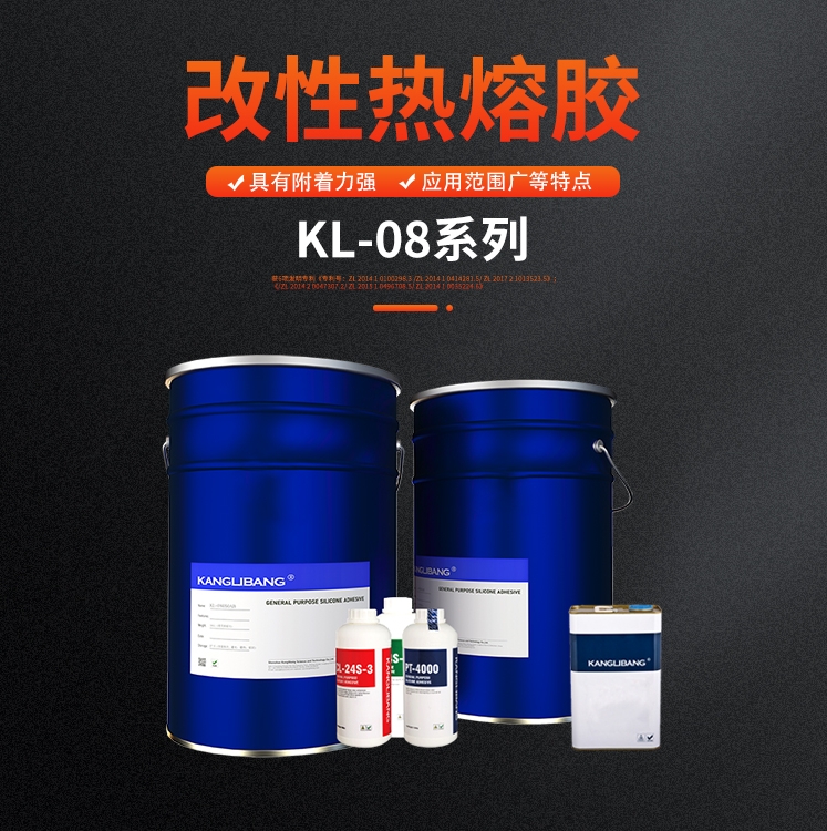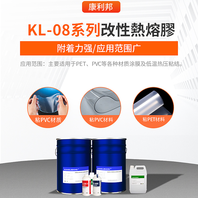 KL-08係列(改(gǎi)性熱熔膠)具(jù)有附著力強,應用範圍(wéi)廣等特點,主要適用於PET、PVC等各種材質塗膜及低溫熱壓粘結.