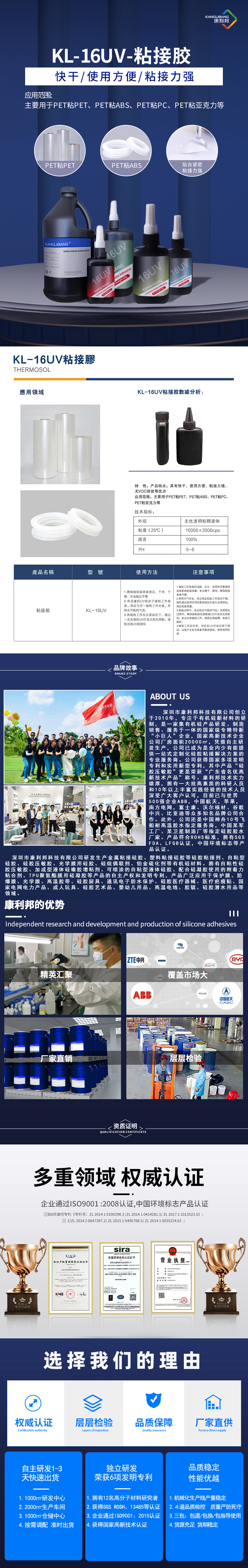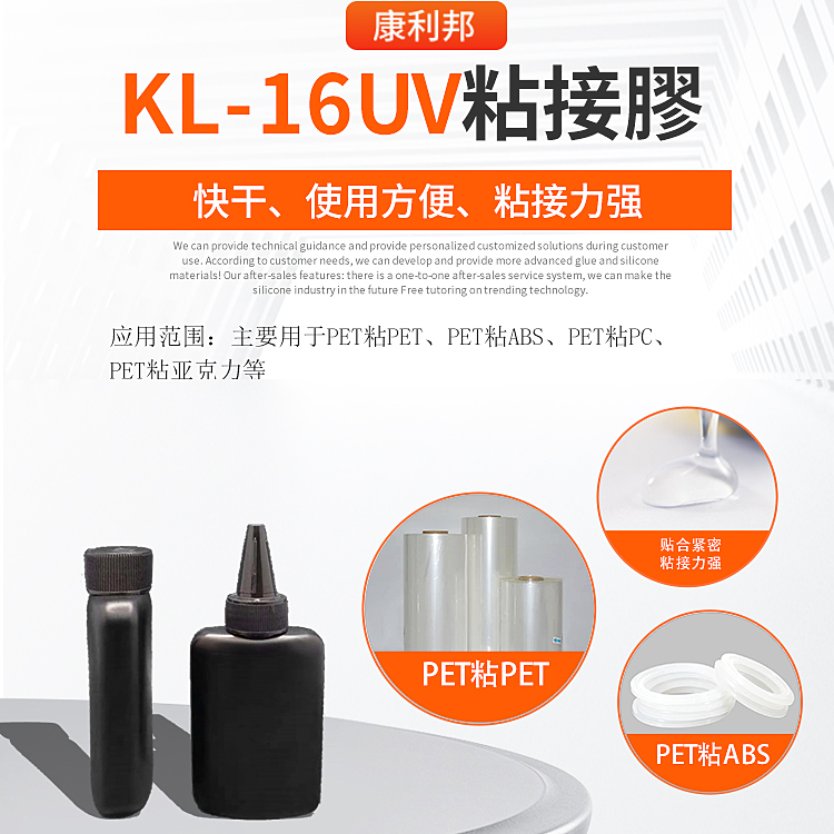 KL-16UV粘接膠具有快幹、使用方便、粘接(jiē)力強、無VOC排放等優點,主要用於PET粘PET、PET粘ABS、PET粘PC、PET粘亞克力等