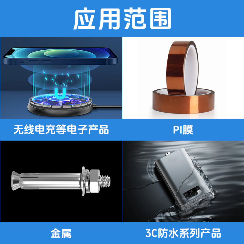 應用:1、無(wú)線電充等電子產品 2、PI膜、金(jīn)屬等基材 3、3C防水係列產品